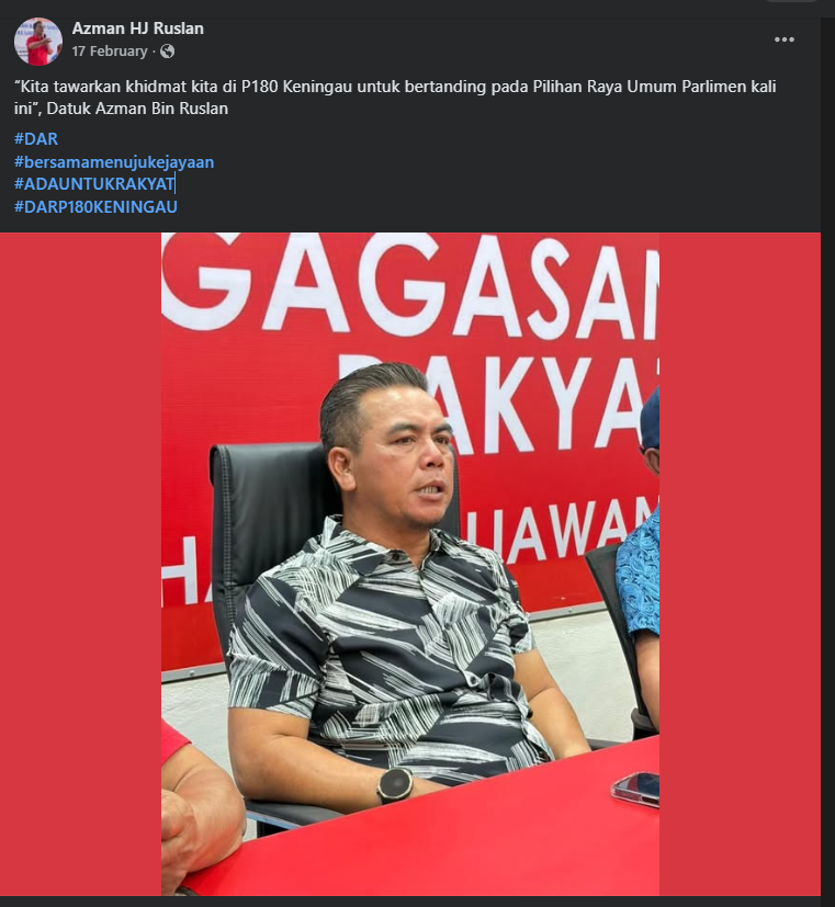 “Kita tawarkan khidmat kita di P180 Keningau untuk bertanding pada Pilihan Raya Umum Parlimen kali ini” — Datuk Azman Bin Ruslan